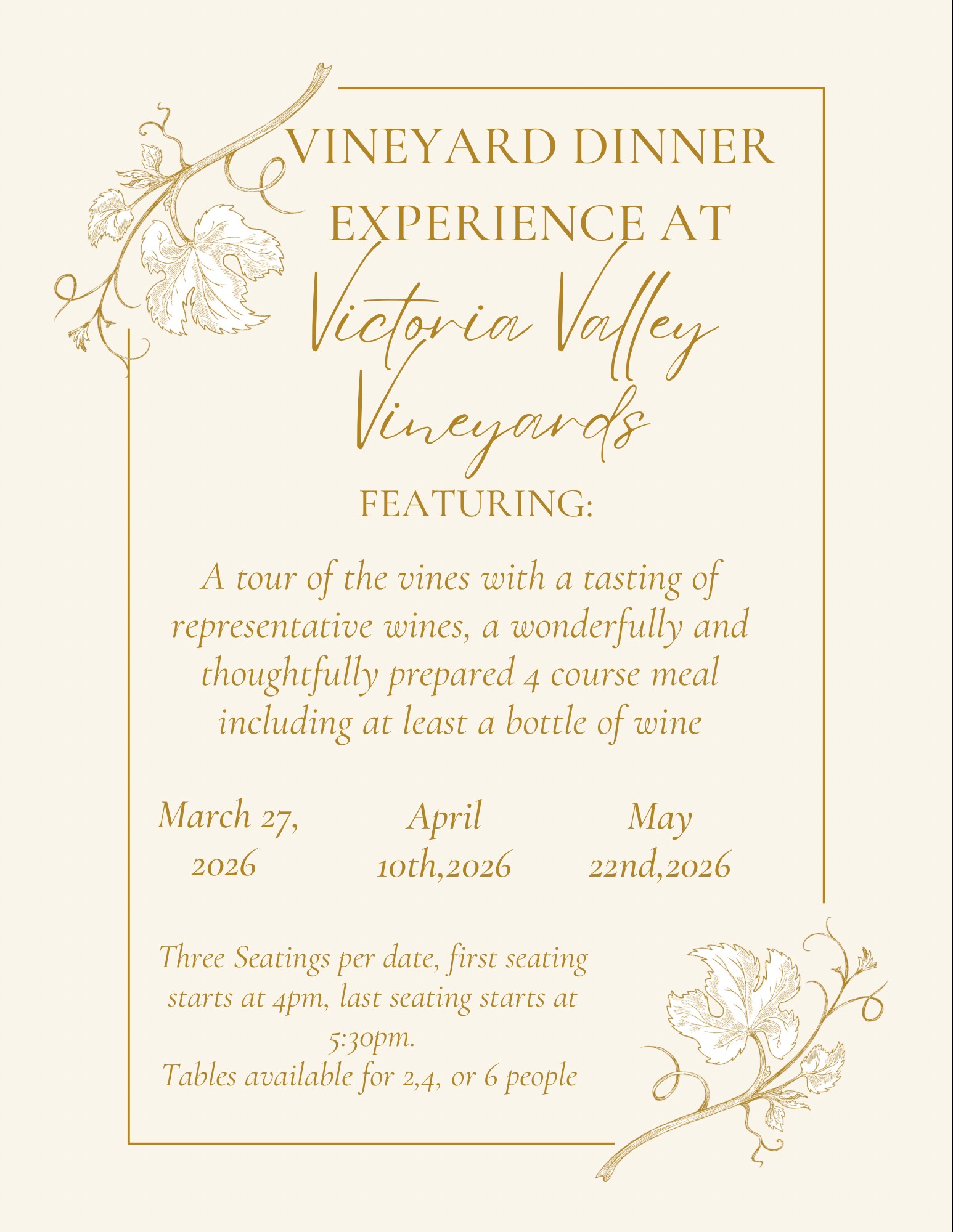 April 17th from 6 pm to 8:30 pm, as we celebrate friendship and good food in the picturesque setting of Victoria Valley Vineyards.